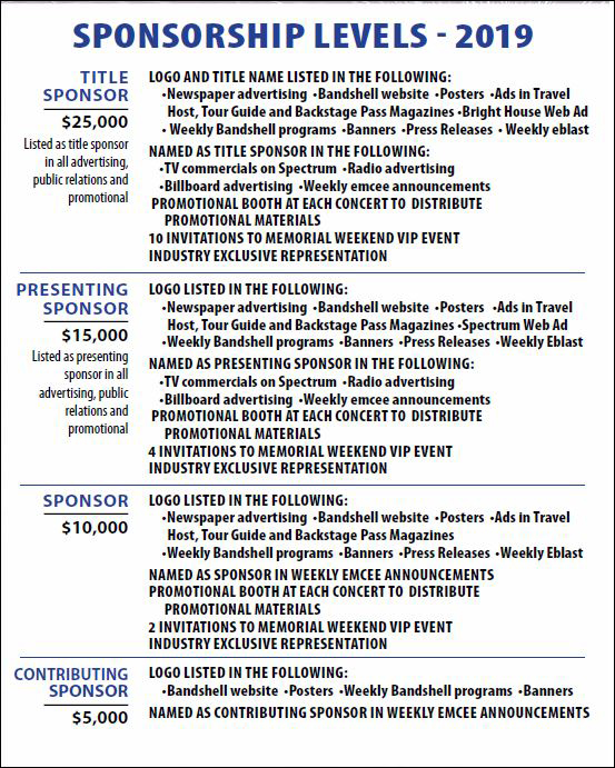 The Friends of the Bandshell Board have been arranging free concerts for our community and preserving the history of this wonderful historic venue for many years. This volunteer board has successfully received grants to restore the bandshell and raises all the necessary funds to put together free activities and music through the year for our community and guests. We hope that you can support our cause and keep this historic venue alive for our citizens. We need your support in making this happen. If you could assist us with one of these sponsorship opportunities it would be greatly appreciated.